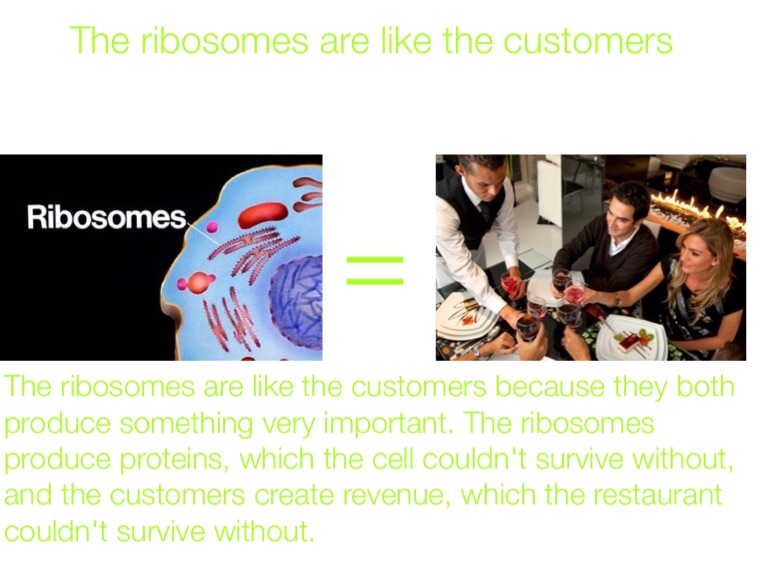 The ribosomes are like the customers because they both produce something very important. The ribosomes produce proteins, which the cell couldn't survive without, and the customers create revenue, which the restaurant couldn't survive without.