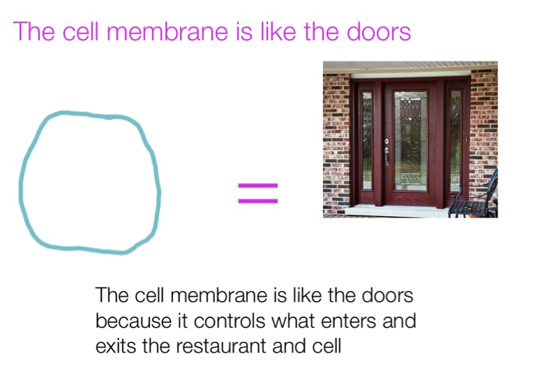 The cell membrane is like the doors because it controls what enters and exits the restaurant and cell