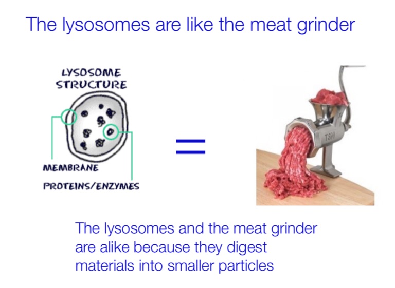 The lysosomes and the meat grinder are alike because they digest materials into smaller particles