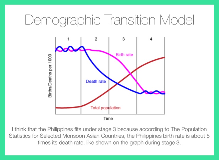 I think that the Philippines fits under stage 3 because according to The Population Statistics for Selected Monsoon Asian Countries, the Philippines birth rate is about 5 times its death rate, like shown on the graph during stage 3.