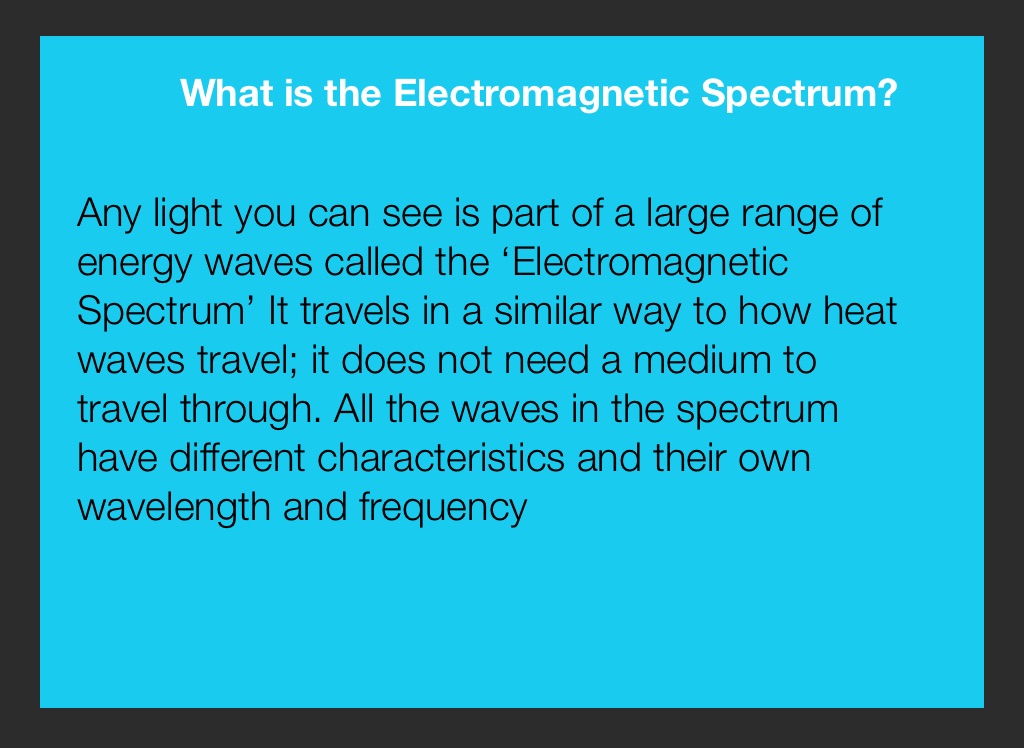 Any light you can see is part of a large range of energy waves called the ‘Electromagnetic Spectrum’ It travels in a similar way to how heat waves travel; it does not need a medium to travel through. All the waves in the spectrum have different characteristics and their own wavelength and frequency