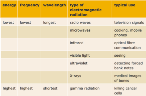Table via BBC Bitesize showing all the different types of waves and their characteristics, and what their usual uses