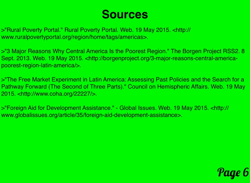 >"3 Major Reasons Why Central America Is the Poorest Region." The Borgen Project RSS2. 8 Sept. 2013. Web. 19 May 2015. <http://borgenproject.org/3-major-reasons-central-america-poorest-region-latin-america/>.