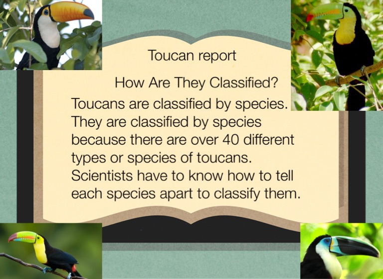 Toucans are classified by species. They are classified by species because there are over 40 different types or species of toucans. Scientists have to know how to tell each species apart to classify them.
