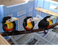 A toucan baby does not look like its parents. It has a broad flat beak and bare red skin. For the first 3 weeks of a toucans life its eyes are tightly shut. They also only have a few fluffy feathers covering their body. To care for their young both adults go out getting fruits, insects, and sometimes even lizards for the baby to eat. The adults also help out around the nest by cleaning waste and garbage and throwing it out with their beaks. Also at least one of them sleeps in the nest with the child to keep it warm.