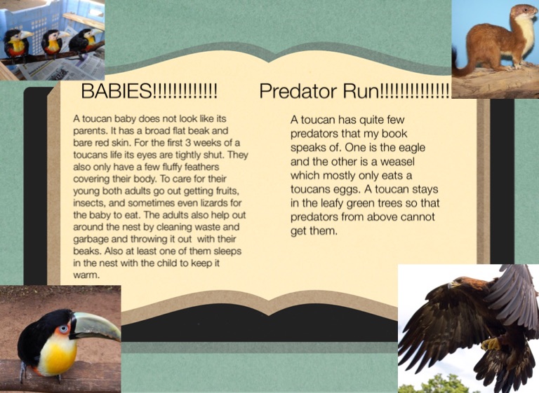 A toucan has quite few predators that my book speaks of. One is the eagle and the other is a weasel which mostly only eats a toucans eggs. A toucan stays in the leafy green trees so that predators from above cannot get them.