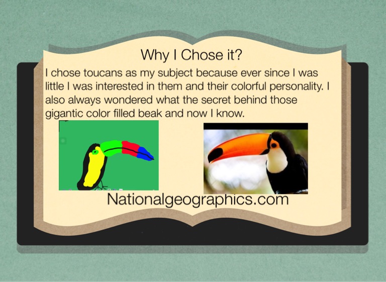 I chose toucans as my subject because ever since I was little I was interested in them and their colorful personality. I also always wondered what the secret behind those gigantic color filled beak and now I know.