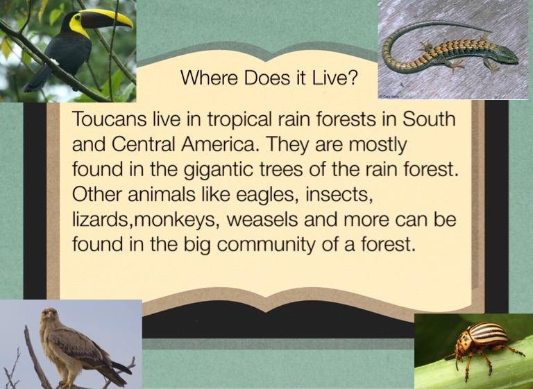 Toucans live in tropical rain forests in South and Central America. They are mostly found in the gigantic trees of the rain forest. Other animals like eagles, insects, lizards,monkeys, weasels and more can be found in the big community of a forest.