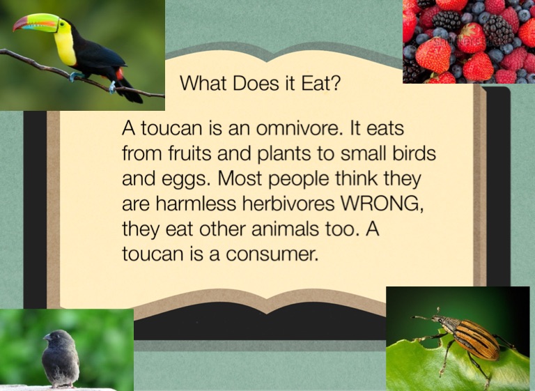 A toucan is an omnivore. It eats from fruits and plants to small birds and eggs. Most people think they are harmless herbivores WRONG, they eat other animals too. A toucan is a consumer.