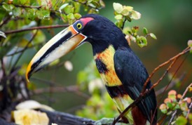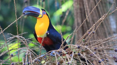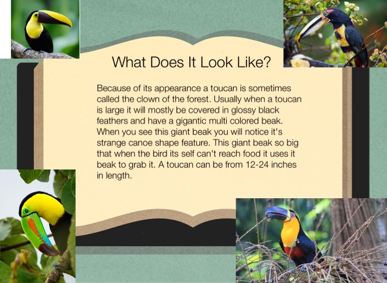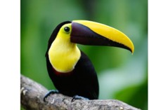 Because of its appearance a toucan is sometimes called the clown of the forest. Usually when a toucan is large it will mostly be covered in glossy black feathers and have a gigantic multi colored beak. When you see this giant beak you will notice it's strange canoe shape feature. This giant beak so big that when the bird its self can't reach food it uses it beak to grab it. A toucan can be from 12-24 inches in length.