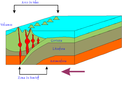 En la tectónica de placas se describen zonas de subducción donde la corteza se introduce debajo del manto y puede provocar grietas por donde asciende el magma y forma un volcán. Por tanto los volcanes están asociados a los bordes de subducción.
