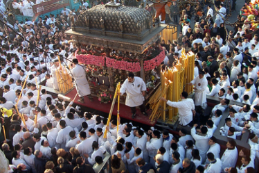 The thirteenth-century shrine of the third-century martyr St. Agatha of Catania (right) is still carried through the town each year on the day of the saint’s feast (5 February), drawing hundreds of pilgrims and visitors to the town (below)