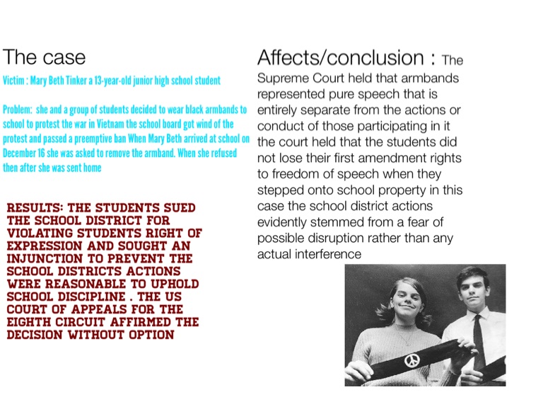 Affects/conclusion : The Supreme Court held that armbands represented pure speech that is entirely separate from the actions or conduct of those participating in it the court held that the students did not lose their first amendment rights to freedom of speech when they stepped onto school property in this case the school district actions evidently stemmed from a fear of possible disruption rather than any actual interference