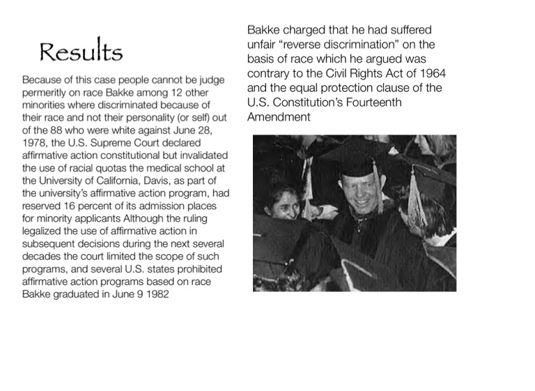 Because of this case people cannot be judge permeritly on race Bakke among 12 other minorities where discriminated because of their race and not their personality (or self) out of the 88 who were white against June 28, 1978, the U.S. Supreme Court declared affirmative action constitutional but invalidated the use of racial quotas the medical school at the University of California, Davis, as part of the university’s affirmative action program, had reserved 16 percent of its admission places for minority applicants Although the ruling legalized the use of affirmative action in subsequent decisions during the next several decades the court limited the scope of such programs, and several U.S. states prohibited affirmative action programs based on race Bakke graduated in June 9 1982