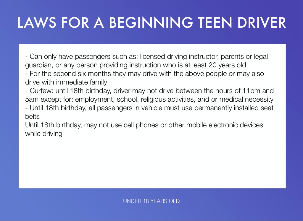 - Can only have passengers such as: licensed driving instructor, parents or legal guardian, or any person providing instruction who is at least 20 years old