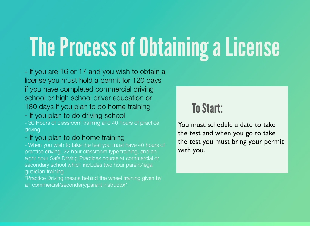 - When you wish to take the test you must have 40 hours of practice driving, 22 hour classroom type training, and an eight hour Safe Driving Practices course at commercial or secondary school which includes two hour parent/legal guardian training