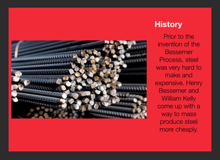 Prior to the invention of the Bessemer Process, steel was very hard to make and expensive. Henry Bessemer and William Kelly come up with a way to mass produce steel more cheaply.
