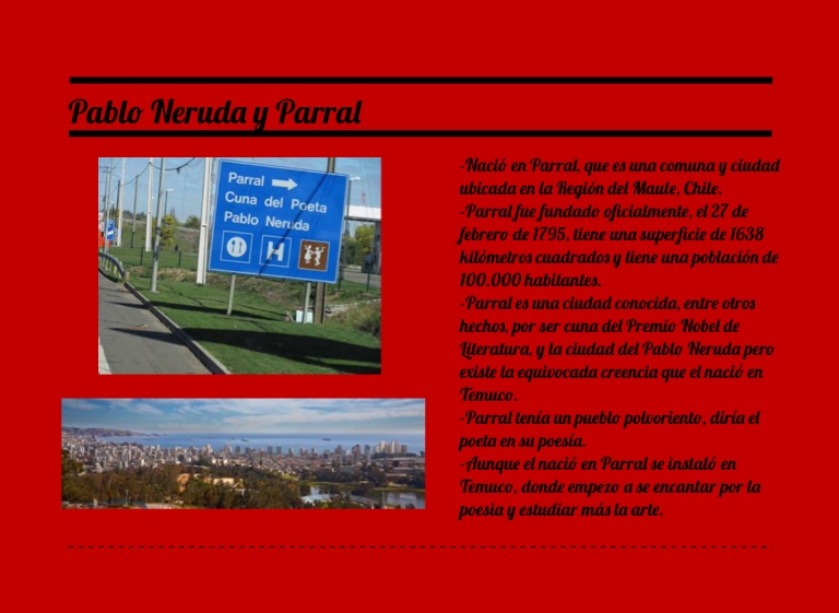 -Parral es una ciudad conocida, entre otros hechos, por ser cuna del Premio Nobel de Literatura, y la ciudad del Pablo Neruda pero existe la equivocada creencia que el nació en Temuco.