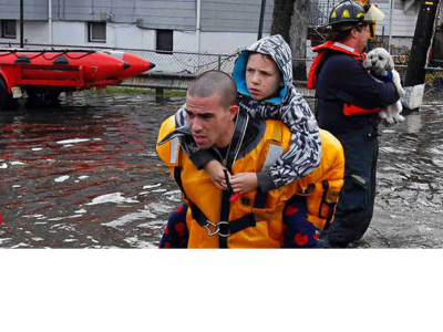 This is a save the children member helping a lost child in the aftermath of hurricane sandy.