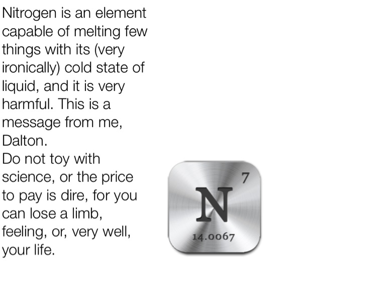 Nitrogen is an element capable of melting few things with its (very ironically) cold state of liquid, and it is very harmful. This is a message from me, Dalton.