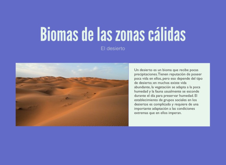 Un desierto es un bioma que recibe pocas precipitaciones. Tienen reputación de poseer poca vida en ellos, pero eso depende del tipo de desierto; en muchos existe vida abundante, la vegetación se adapta a la poca humedad y la fauna usualmente se esconde durante el día para preservar humedad. El establecimiento de grupos sociales en los desiertos es complicado y requiere de una importante adaptación a las condiciones extremas que en ellos imperan.