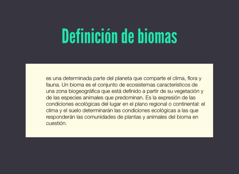 es una determinada parte del planeta que comparte el clima, flora y fauna. Un bioma es el conjunto de ecosistemas característicos de una zona biogeográfica que está definido a partir de su vegetación y de las especies animales que predominan. Es la expresión de las condiciones ecológicas del lugar en el plano regional o continental: el clima y el suelo determinarán las condiciones ecológicas a las que responderán las comunidades de plantas y animales del bioma en cuestión.