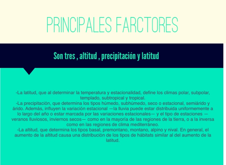 -La latitud, que al determinar la temperatura y estacionalidad, define los climas polar, subpolar, templado, subtropical y tropical.