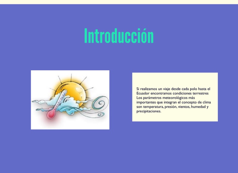 Si realizamos un viaje desde cada polo hasta el Ecuador encontramos condiciones terrestres Los parámetros meteorológicos más importantes que integran el concepto de clima son temperatura, presión, vientos, humedad y precipitaciones.