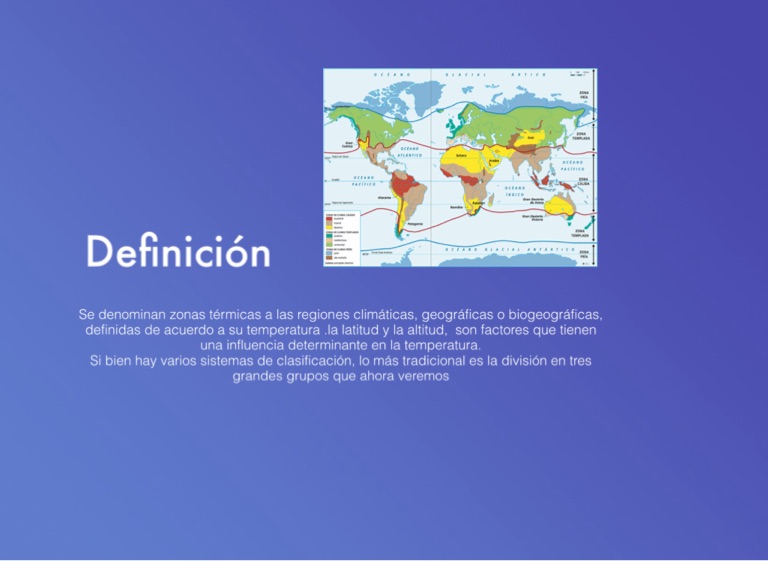 Se denominan zonas térmicas a las regiones climáticas, geográficas o biogeográficas, definidas de acuerdo a su temperatura .la latitud y la altitud, son factores que tienen una influencia determinante en la temperatura.