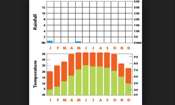 The average rainfall is about 5 inches of rain a year. When it rains, it is usually a torrential downpour.