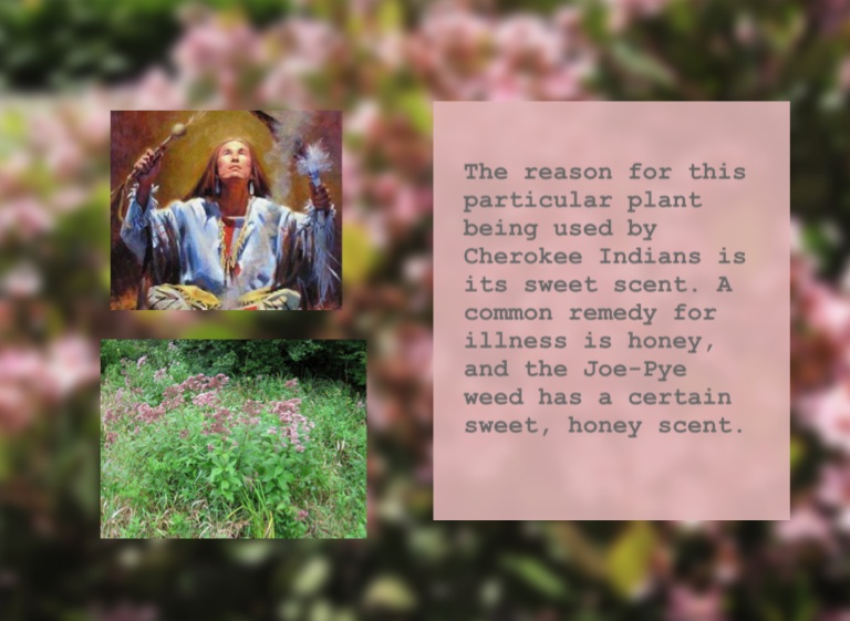 The reason for this particular plant being used by Cherokee Indians is its sweet scent. A common remedy for illness is honey, and the Joe-Pye weed has a certain sweet, honey scent.