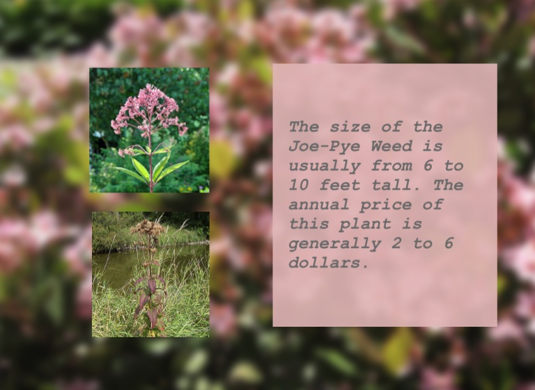 The size of the Joe-Pye Weed is usually from 6 to 10 feet tall. The annual price of this plant is generally 2 to 6 dollars.