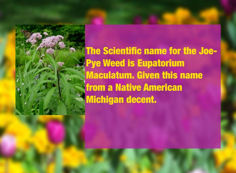 The Scientific name for the Joe-Pye Weed is Eupatorium Maculatum. Given this name from a Native American Michigan decent.