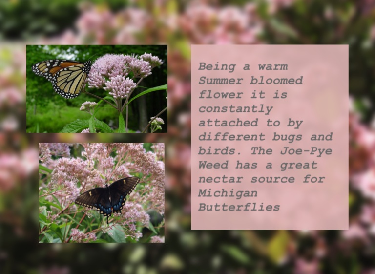 Being a warm Summer bloomed flower it is constantly attached to by different bugs and birds. The Joe-Pye Weed has a great nectar source for Michigan Butterflies
