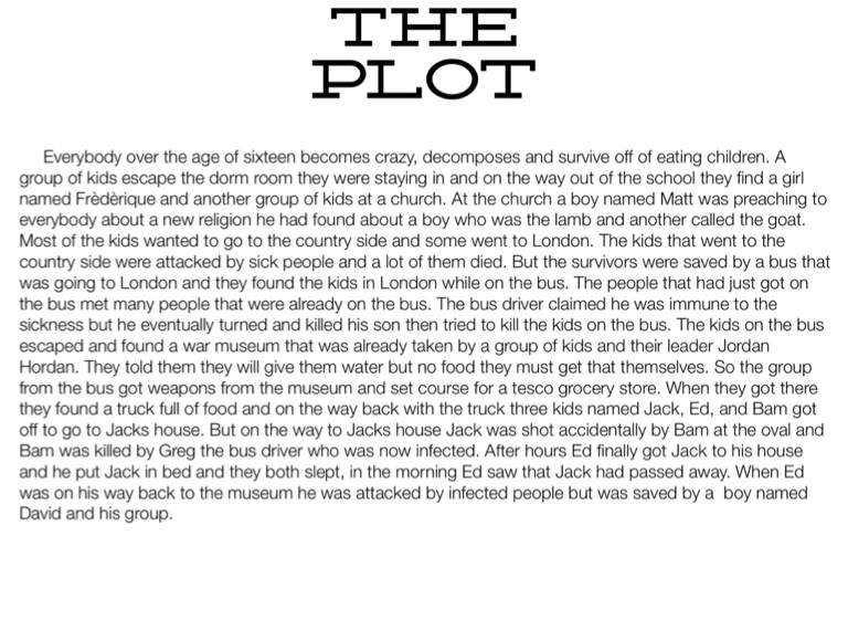 Everybody over the age of sixteen becomes crazy, decomposes and survive off of eating children. A group of kids escape the dorm room they were staying in and on the way out of the school they find a girl named Frèdèrique and another group of kids at a church. At the church a boy named Matt was preaching to everybody about a new religion he had found about a boy who was the lamb and another called the goat. Most of the kids wanted to go to the country side and some went to London. The kids that went to the country side were attacked by sick people and a lot of them died. But the survivors were saved by a bus that was going to London and they found the kids in London while on the bus. The people that had just got on the bus met many people that were already on the bus. The bus driver claimed he was immune to the sickness but he eventually turned and killed his son then tried to kill the kids on the bus. The kids on the bus escaped and found a war museum that was already taken by a group of kids and their leader Jordan Hordan. They told them they will give them water but no food they must get that themselves. So the group from the bus got weapons from the museum and set course for a tesco grocery store. When they got there they found a truck full of food and on the way back with the truck three kids named Jack, Ed, and Bam got off to go to Jacks house. But on the way to Jacks house Jack was shot accidentally by Bam at the oval and Bam was killed by Greg the bus driver who was now infected. After hours Ed finally got Jack to his house and he put Jack in bed and they both slept, in the morning Ed saw that Jack had passed away. When Ed was on his way back to the museum he was attacked by infected people but was saved by a boy named David and his group.