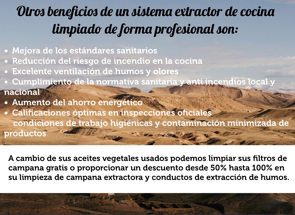 A cambio de sus aceites vegetales usados podemos limpiar sus filtros de campana gratis o proporcionar un descuento desde 50% hasta 100% en su limpieza de campana extractora y conductos de extracción de humos.