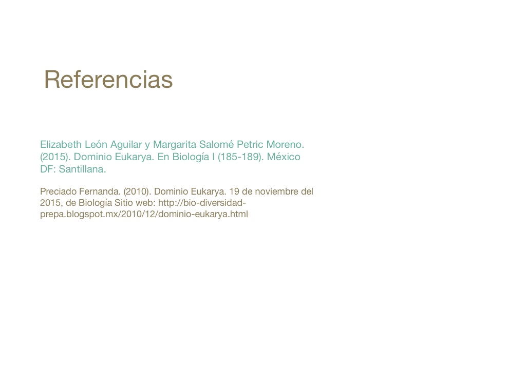 Preciado Fernanda. (2010). Dominio Eukarya. 19 de noviembre del 2015, de Biología Sitio web: http://bio-diversidad-prepa.blogspot.mx/2010/12/dominio-eukarya.html