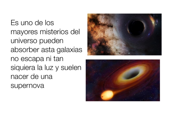 Es uno de los mayores misterios del universo pueden absorber asta galaxias no escapa ni tan siquiera la luz y suelen nacer de una supernova