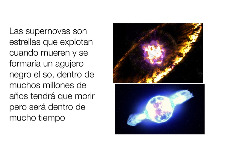 Las supernovas son estrellas que explotan cuando mueren y se formaría un agujero negro el so, dentro de muchos millones de años tendrá que morir pero será dentro de mucho tiempo