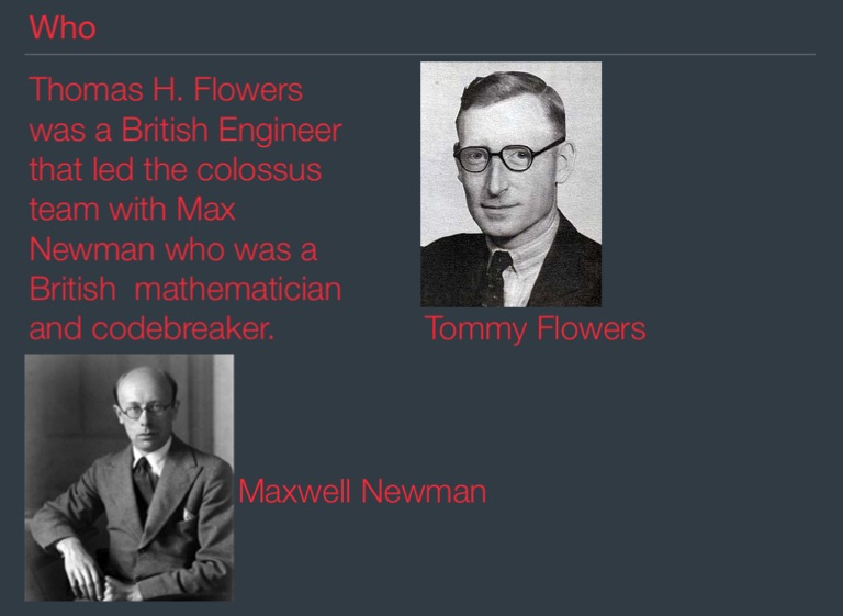 Thomas H. Flowers was a British Engineer that led the colossus team with Max Newman who was a British mathematician and codebreaker.