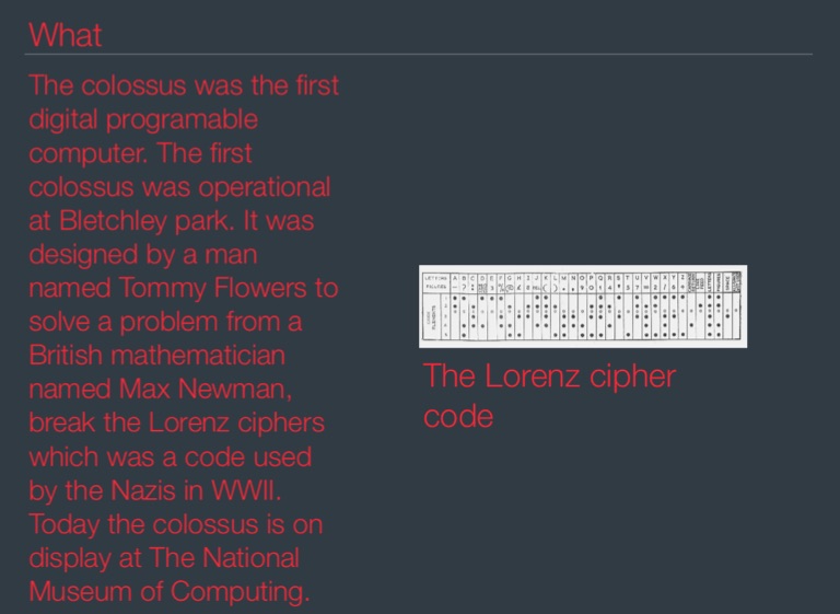 The colossus was the first digital programable computer. The first colossus was operational at Bletchley park. It was designed by a man named Tommy Flowers to solve a problem from a British mathematician named Max Newman, break the Lorenz ciphers which was a code used by the Nazis in WWII.
