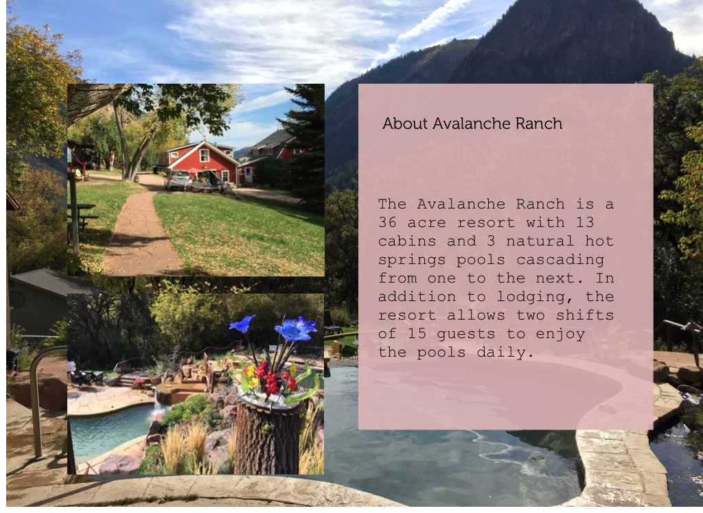 The Avalanche Ranch is a 36 acre resort with 13 cabins and 3 natural hot springs pools cascading from one to the next. In addition to lodging, the resort allows two shifts of 15 guests to enjoy the pools daily.