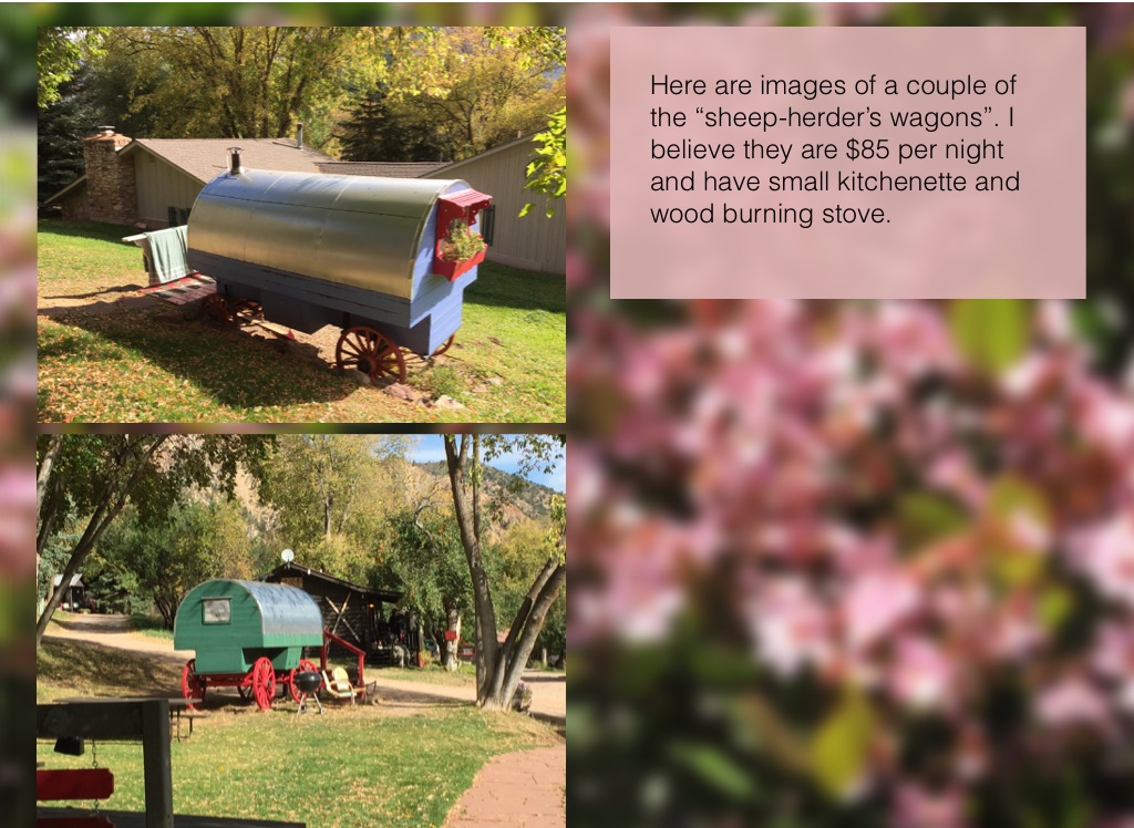 Here are images of a couple of the “sheep-herder’s wagons”. I believe they are $85 per night and have small kitchenette and wood burning stove.