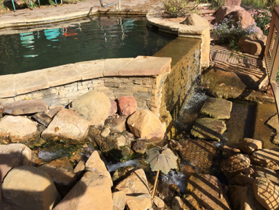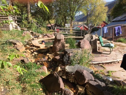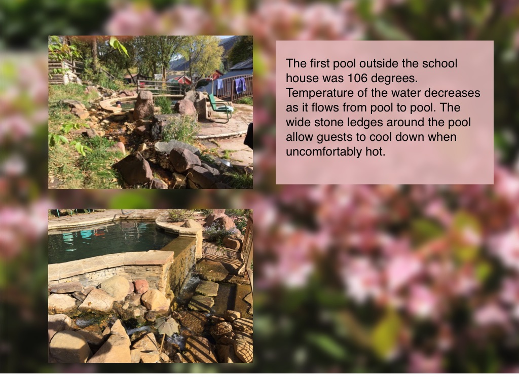The first pool outside the school house was 106 degrees. Temperature of the water decreases as it flows from pool to pool. The wide stone ledges around the pool allow guests to cool down when uncomfortably hot.