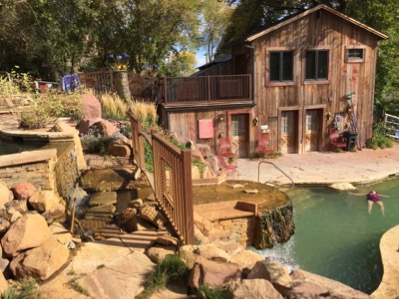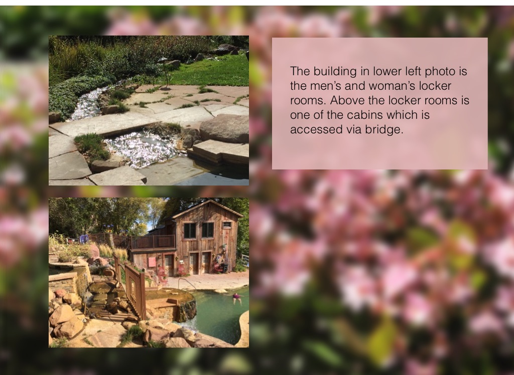 The building in lower left photo is the men’s and woman’s locker rooms. Above the locker rooms is one of the cabins which is accessed via bridge.