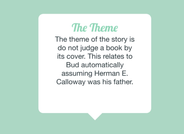 The theme of the story is do not judge a book by its cover. This relates to Bud automatically assuming Herman E. Calloway was his father.
