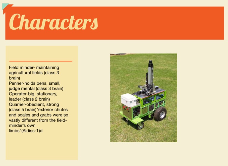 Quarrier-obedient, strong (class 5 brain)"exterior chutes and scales and grabs were so vastly different from the field-minder’s own limbs"(Aldiss-1)d
