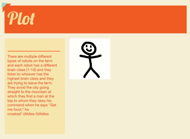 There are multiple different types of robots on the farm and each robot has a different brain class (1-10) and they listen to whoever has the highest brain class and they are trying to leave the farm. They avoid the city going straight to the mountain at which they find a man at the top to whom they obey his command when he says "Get me food,” he croaked" (Aldiss-5)Aldiss