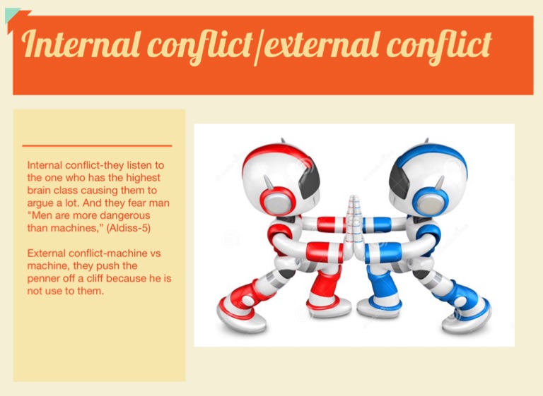Internal conflict-they listen to the one who has the highest brain class causing them to argue a lot. And they fear man "Men are more dangerous than machines,” (Aldiss-5)