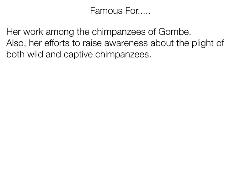 Also, her efforts to raise awareness about the plight of both wild and captive chimpanzees.